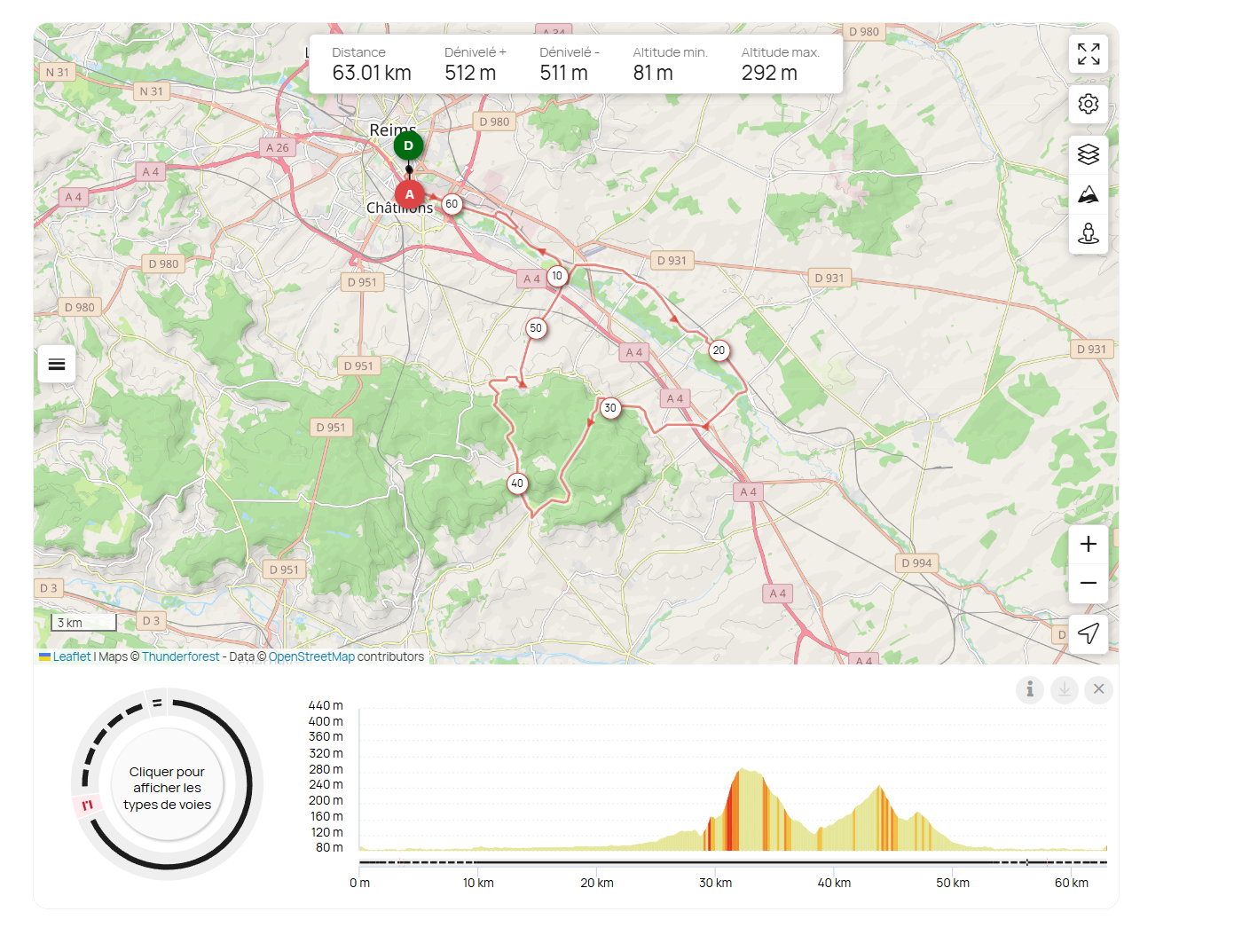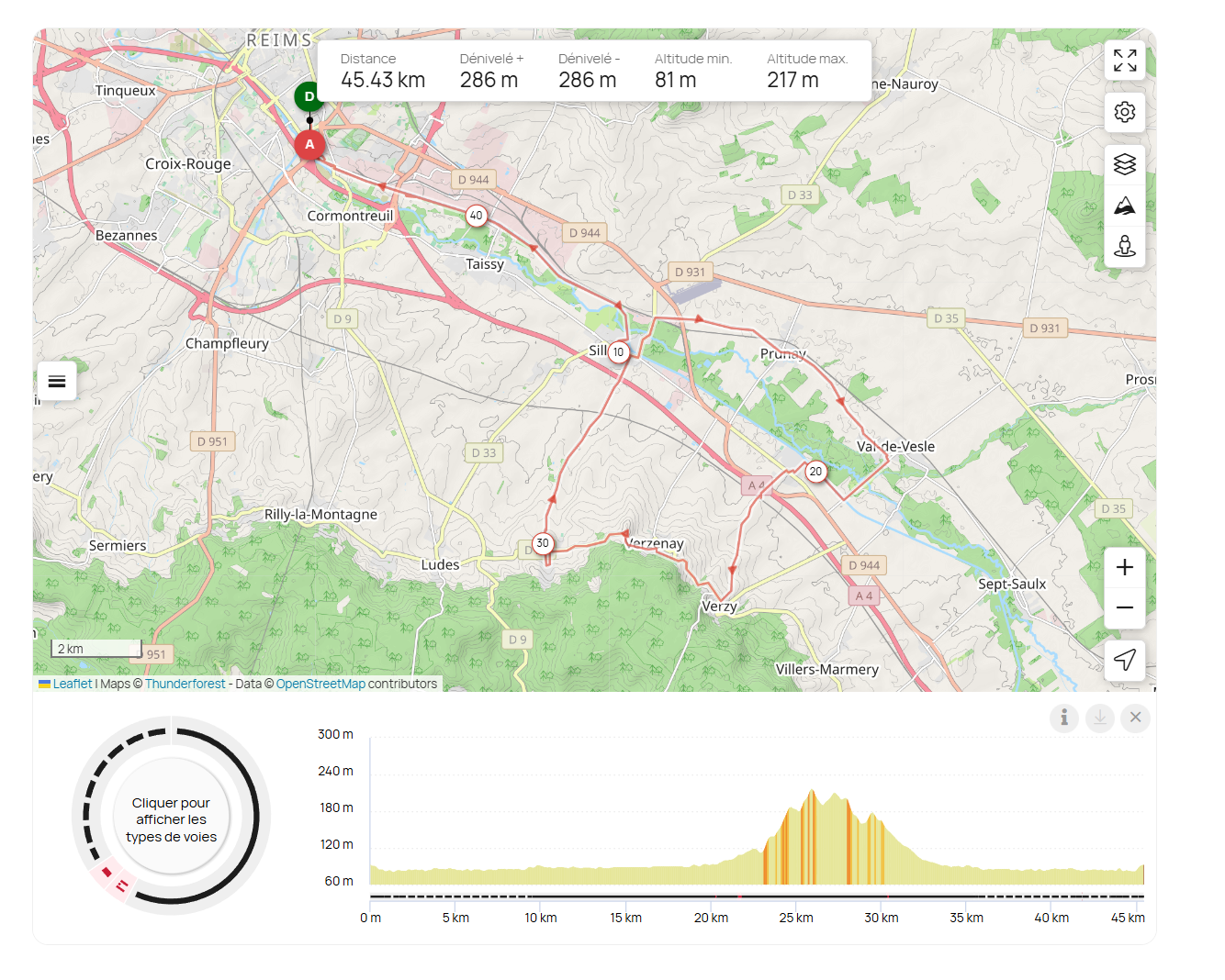 Reims – Voie verte – St Leonard – Sillery – Prunay – Val de Vesle – Sept Saulx – Les Petites Loges – Villers Marmery – Verzy – Louvois – La Neuville en Chaillois – Craon de Ludes – Mailly Champagne – Sillery – Saint Leonard – Reims