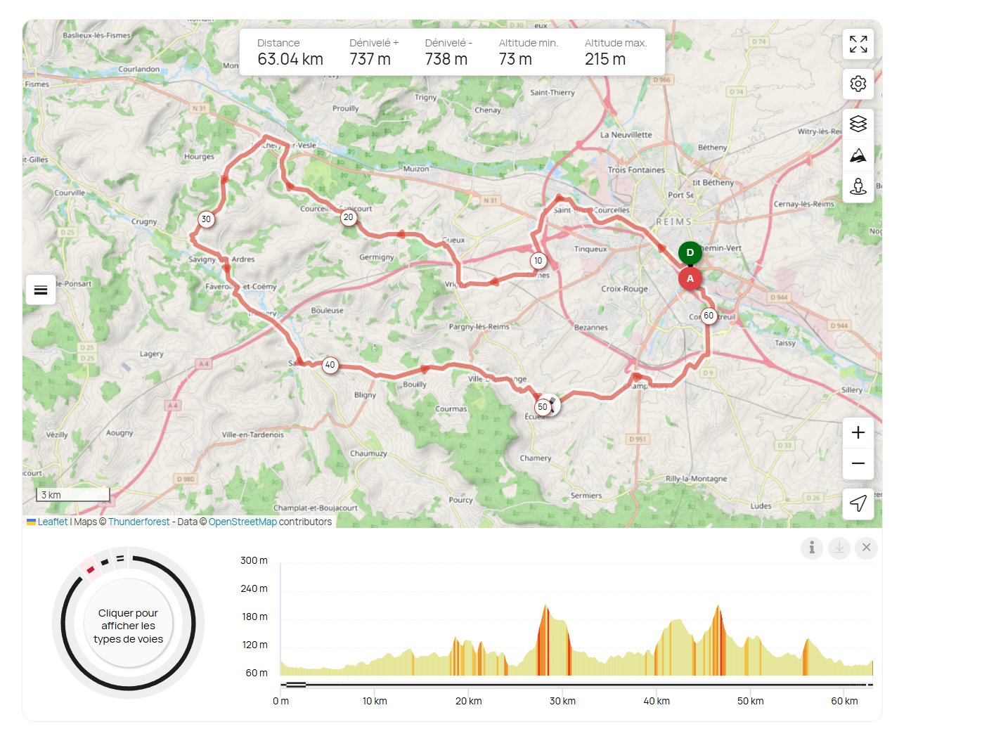 Reims – Saint Brice Courcelles – Champigny – Maco – Muizon – Rosnay – Gueux – Vrigny – Pargny Les Reims – Jouy Les Reims – Sacy – Ecueil – La Garenne – Villers Aux Noeuds – Champfleury – Trois Puits – Cormontreuil – Reims